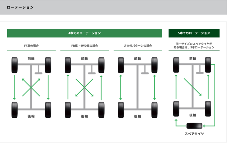 タイヤはローテーションを実施することで長持ちさせることができますのでエコで経済的ですので是非実施してみてはいかがでしょうか。