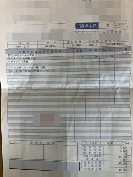 AUDI TTクーペ(8J)7速乾式Sトロニックミッションオイル交換