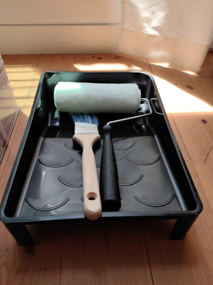 マスキングテープ処理後にやっとシーラーを塗布します。その前に床面が乾いていることを確認してください。私が作業した日は35度を超えている日でしたのですぐ乾きました。