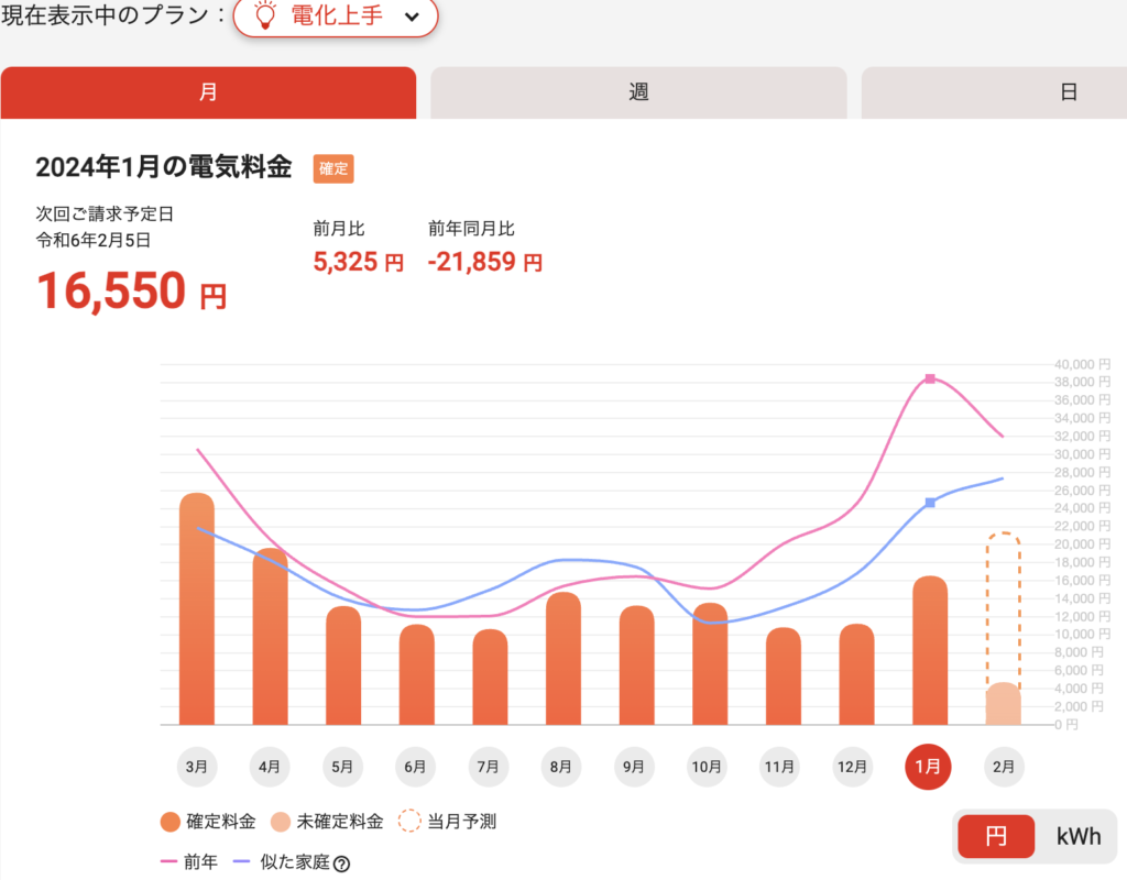 冬季の光熱費高騰の要因は暖房と給湯ですのでそのうちの給湯で日中の発電した電気を効率的に利用して上記のようなパフォーマンスを出せたのかなと考えております。